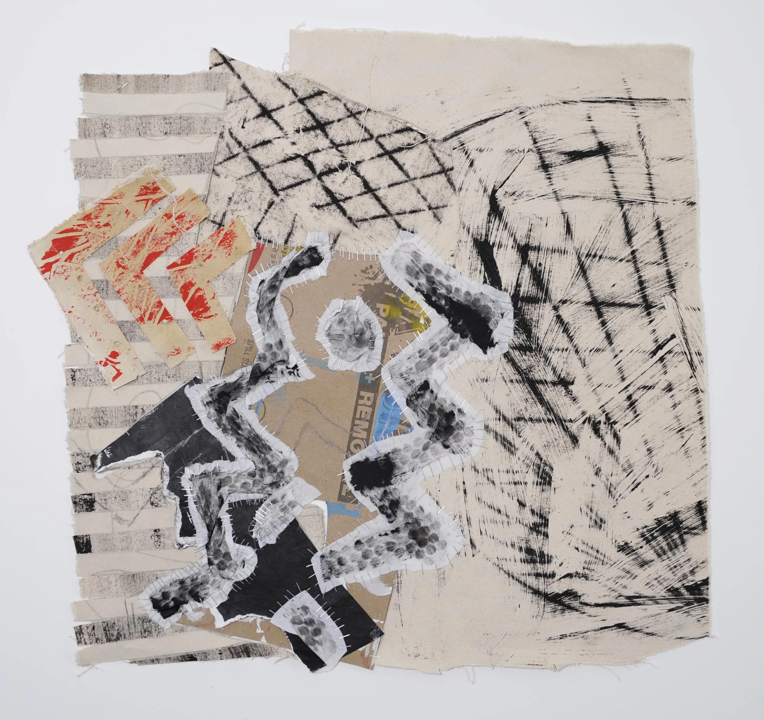 ‘Anthem; red’ (2025) fabric, acrylic, card, plastic packaging, pastel, mixed media