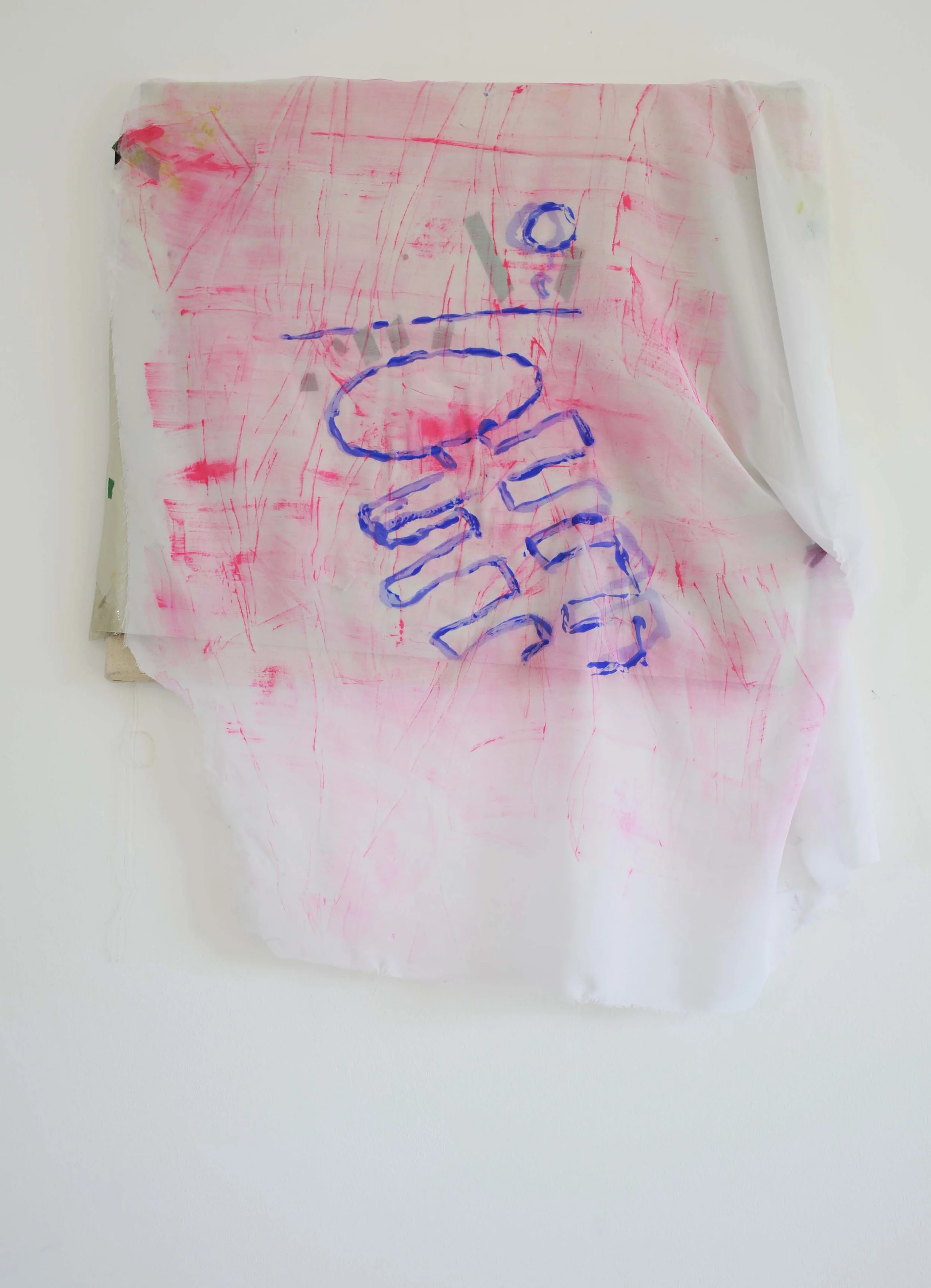 Get up, Blue Object (2024) acrylic, chiffon, paper, tape, stretched canvas